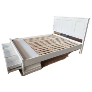 The Cardinia bed can be ordered in queen or king size and is made from solid oak wood. It has 3 storage drawers that can be used to store spare bed linen and clothing. The headboard is 122cm tall and the whole frame has a neutral matte white finish. It comes with a 2-year manufacturer warranty.
