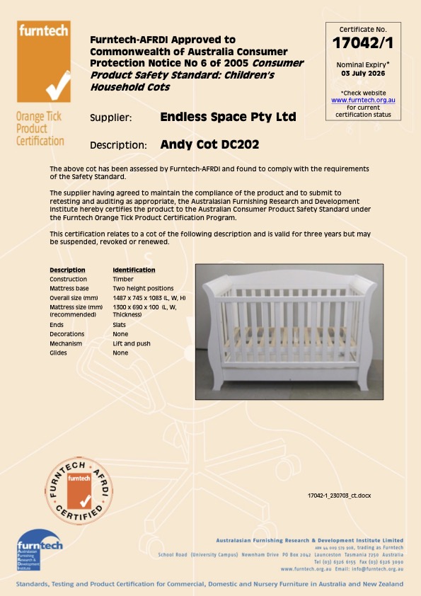 - Furnteck-AFRDI Orange certificate. Meets Australian Standards for Cots