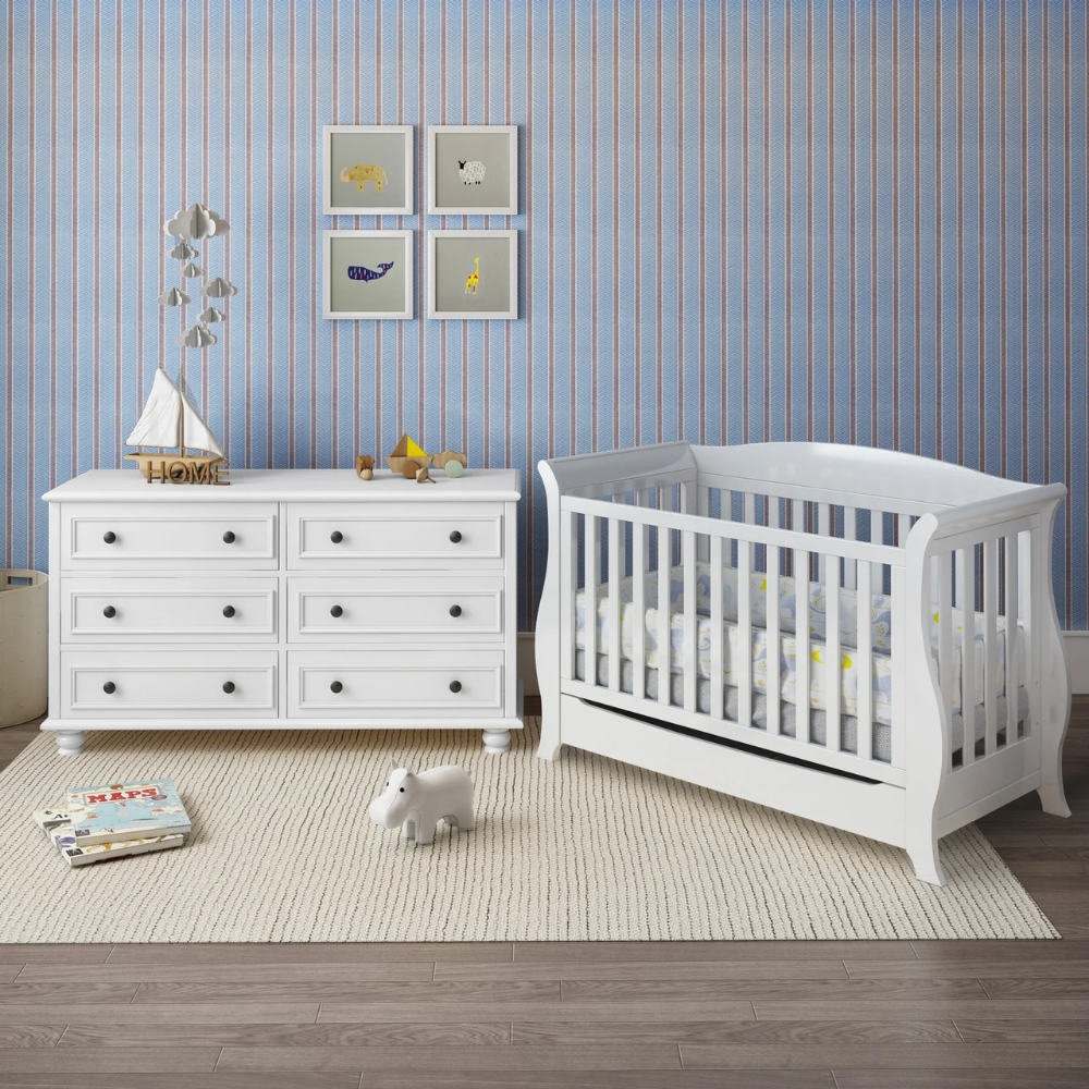For your satisfaction, this piece of furniture is painted with non-toxic, zero VOC Eco Paint which is safe for children. Pregnant women can also buy it as it is not harmful to them as well as 1 Year Manufacturer’s Warranty. they are made of NZ pine wood and MDF mixed about 75kgs. 6 wooden drawers all on soft close runners.Anchor device included for safe