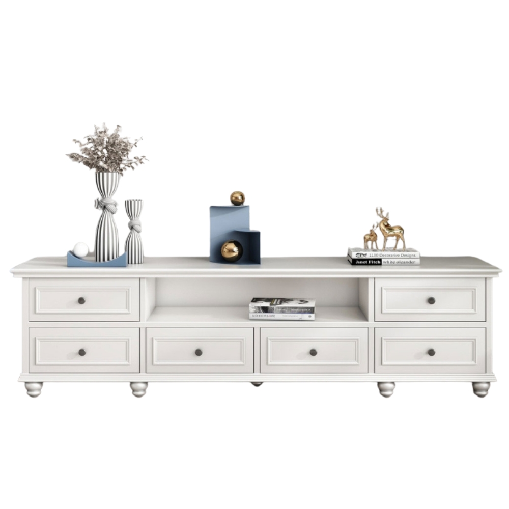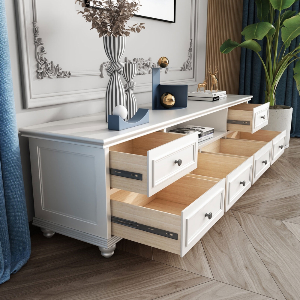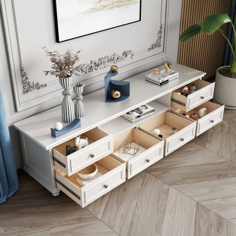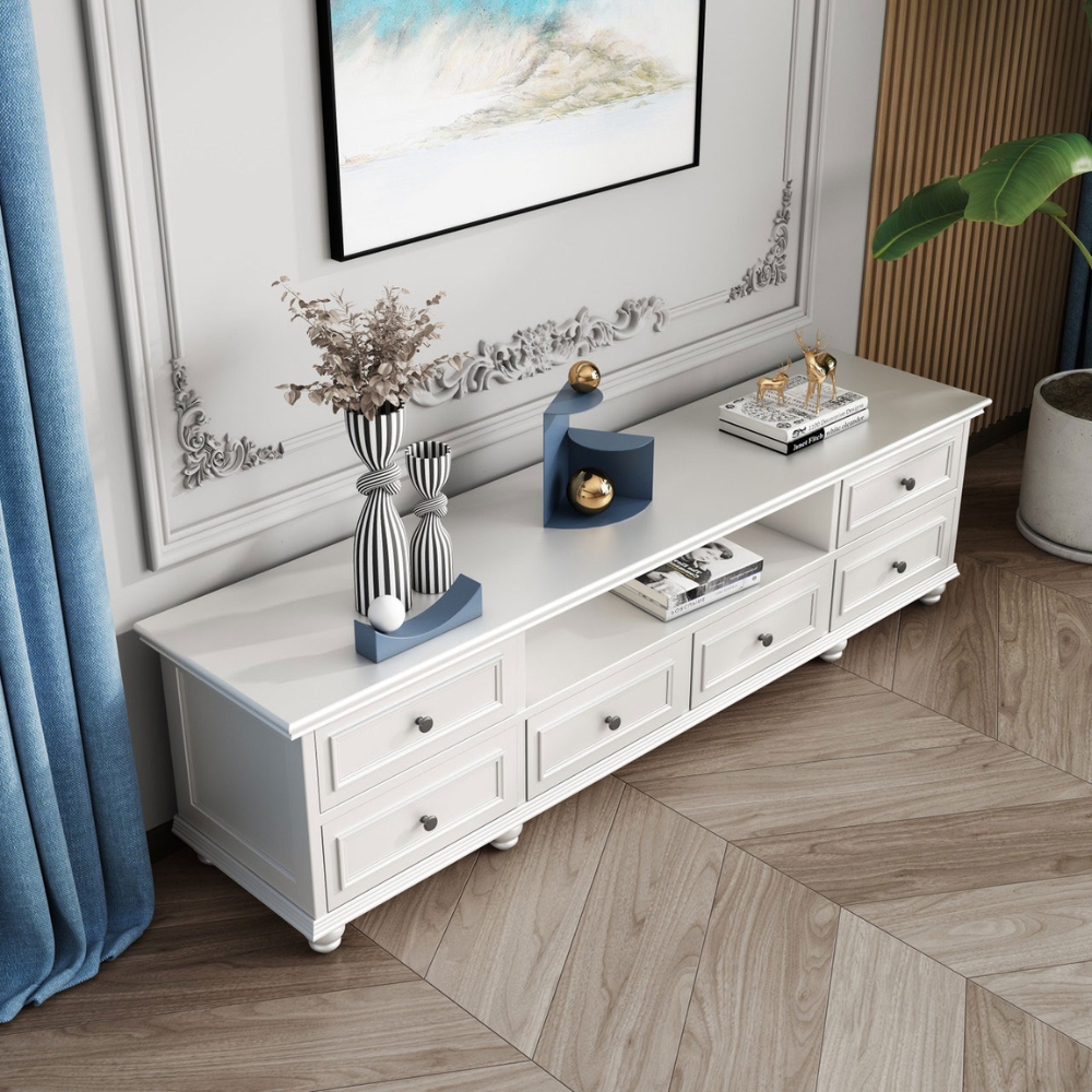 The American country-style TV unit has a classic feel, with bevelled edges and raised detailing on each of the 6 drawers. Each drawer sits on Italian metal runners that are durable and quiet, so they will not interrupt a film or show. The unit is made from New Zealand pine and measures in cm 200(L) x 45(W) x55(H). It comes with a 1-year manufacturer warranty.