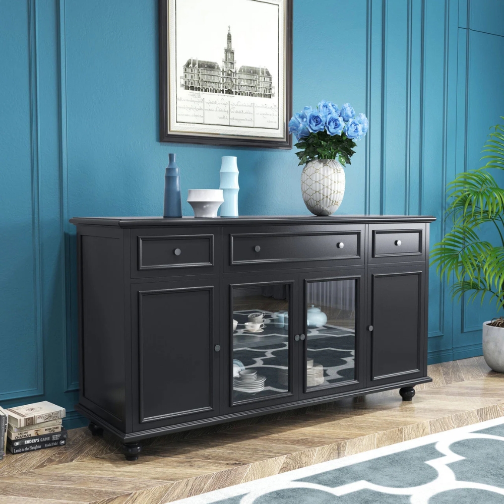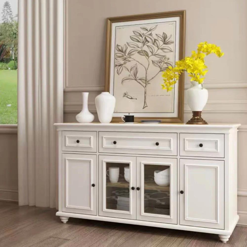 The cabinet features a spacious countertop, ideal for displaying decorative pieces, family photos, or serving dishes during gatherings. Beneath, three upper drawers provide convenient storage for utensils, napkins, or personal items. The four cabinet doors below open to reveal generous storage spaces, with the central compartment boasting clear glass panes, allowing you to showcase your finest dinnerware or cherished collectibles. Elevated slightly off the ground with intricately designed feet, this buffet ensures easy cleaning underneath and adds a delicate finishing touch.