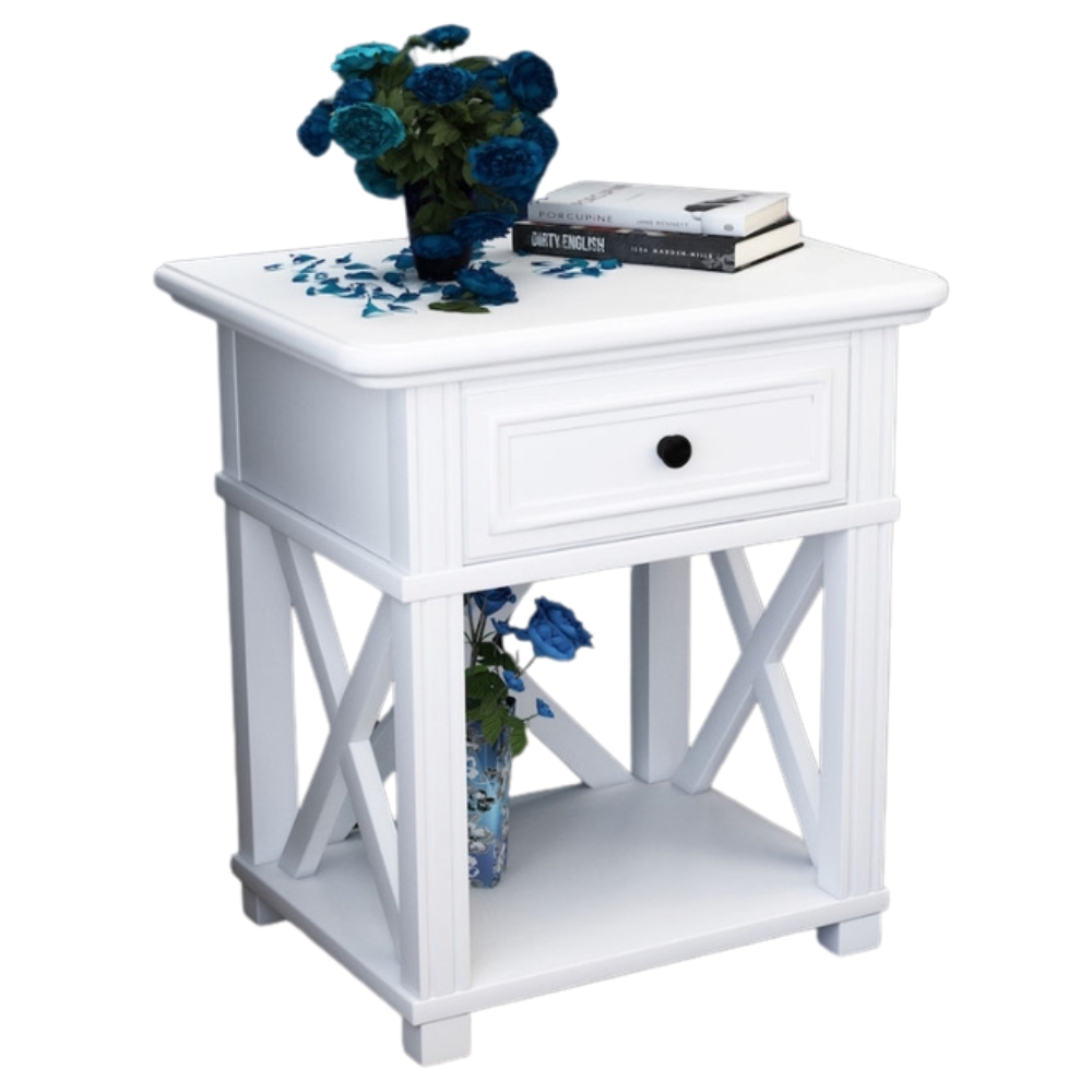 The Beata cross table is perfect for your bedside or for an extra surface in your living room. It is made from strong New Zealand pine and has a clean white finish. The beautiful cross design and quality finish adds a country home aesthetic. It has a drawer and shelving underneath for storage. It has a 1 year manufacturer warranty.