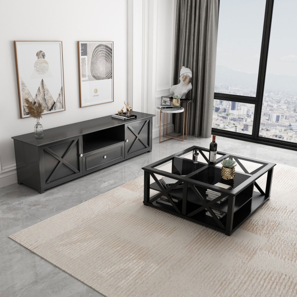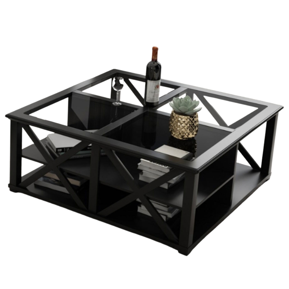 Experience the blend of modern flair and classic elegance with the Beata Cross Coffee Table. Boasting a pristine black finish, this table serves as a sophisticated centerpiece for any contemporary living space. Its striking cross-braced sides not only offer robust stability but also introduce an element of architectural charm. The tabletop, segmented by clear glass panes, provides a unique and functional surface that beautifully reflects light, creating a spacious feel. Below, a spacious lower shelf offers additional storage or display options, perfect for books, magazines, or decorative items. Whether for daily use or special occasions, the Beata Cross Coffee Table promises both style and utility, making it a must-have addition to modern homes.