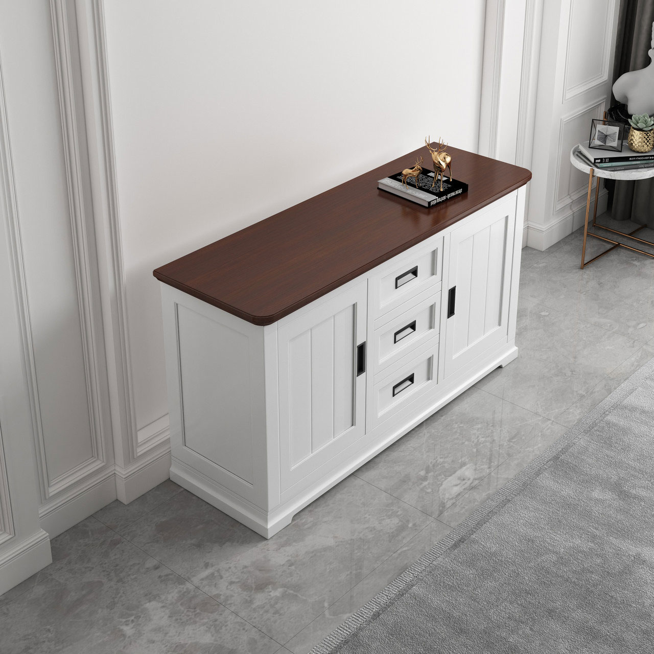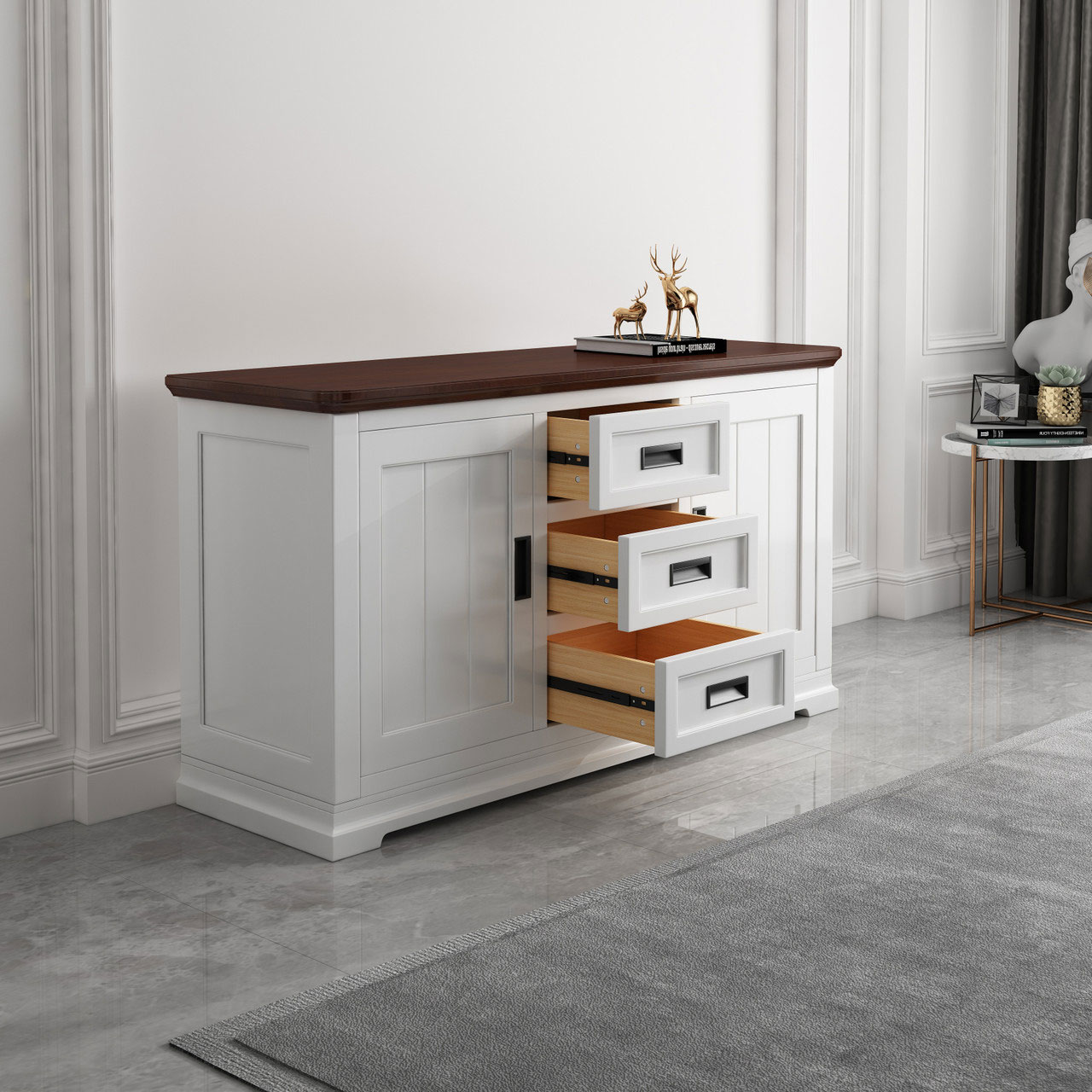 This sideboard has 3 drawers and 2 doors that open onto spacious cupboards. They have flat metal handles which create a modern farmhouse look. It has a solid oak timber top that contrasts with the white coating. It has an anchor device for added safety and comes with a 1-year manufacturer’s warranty.