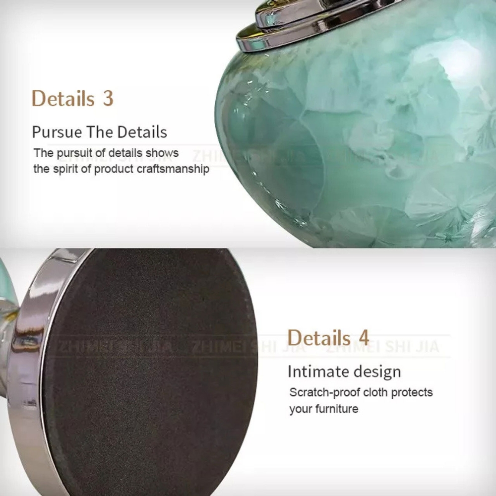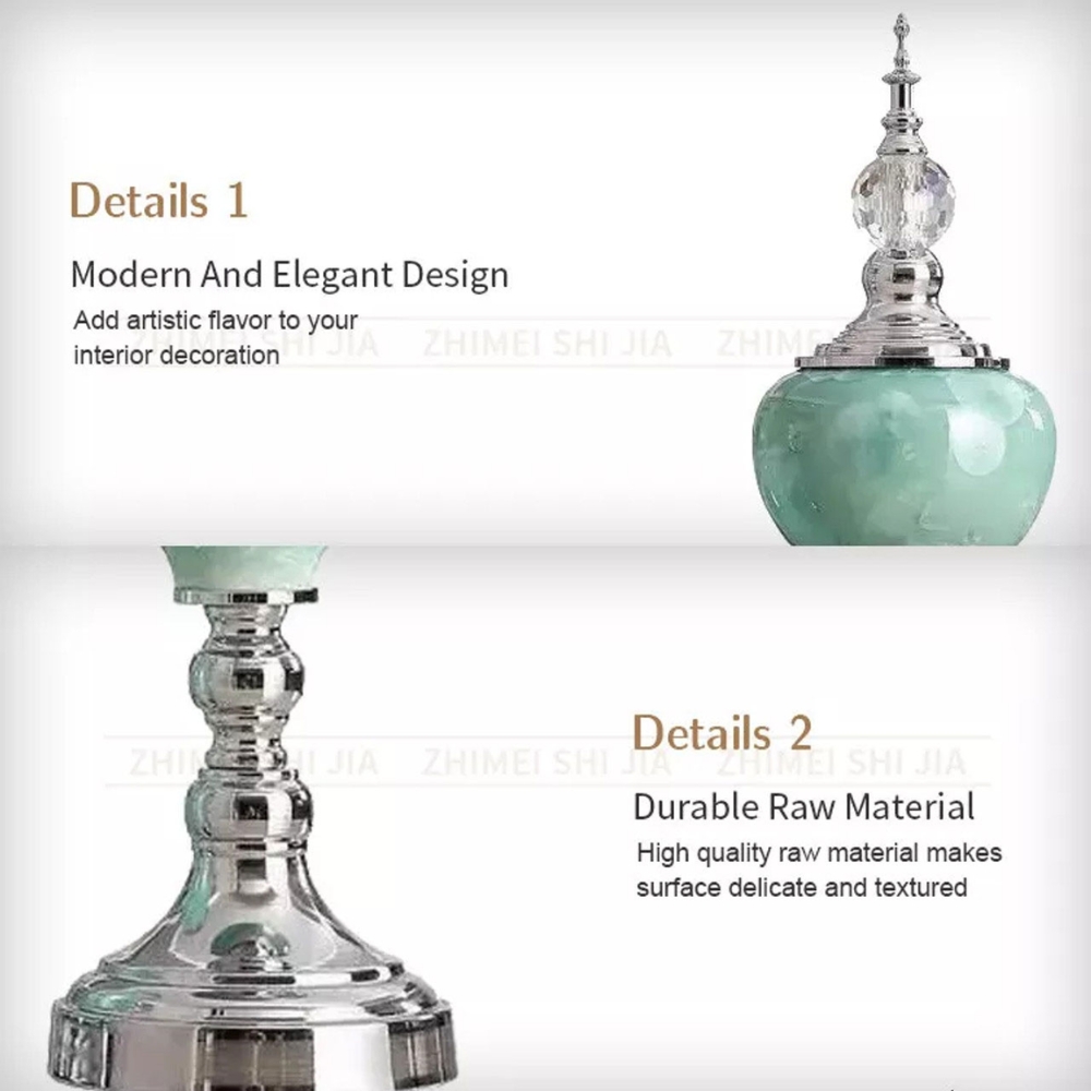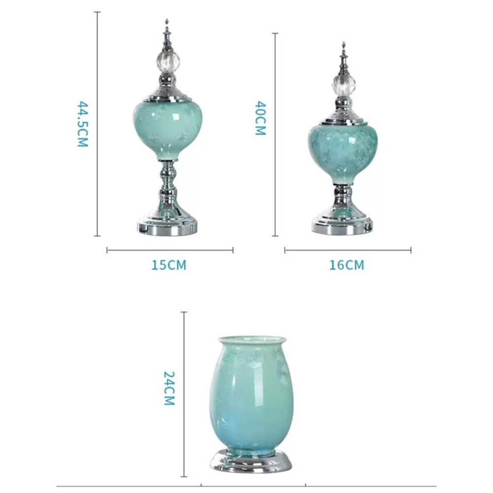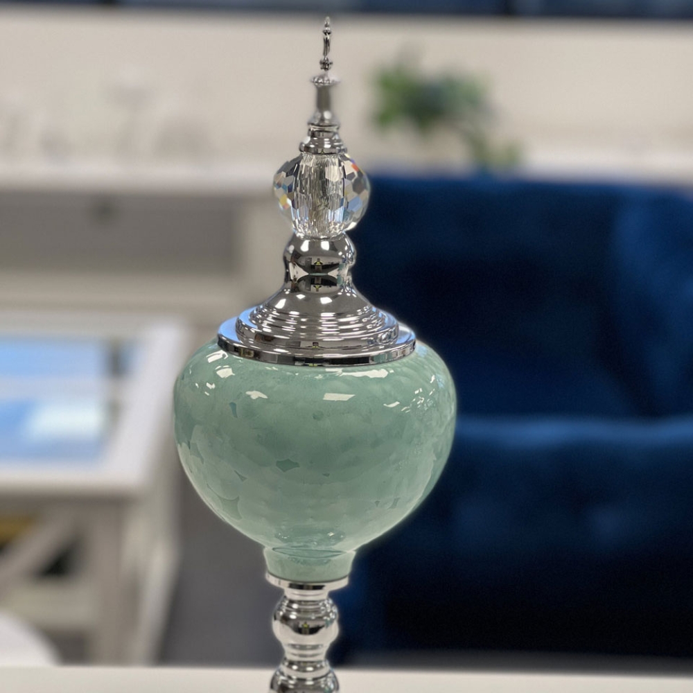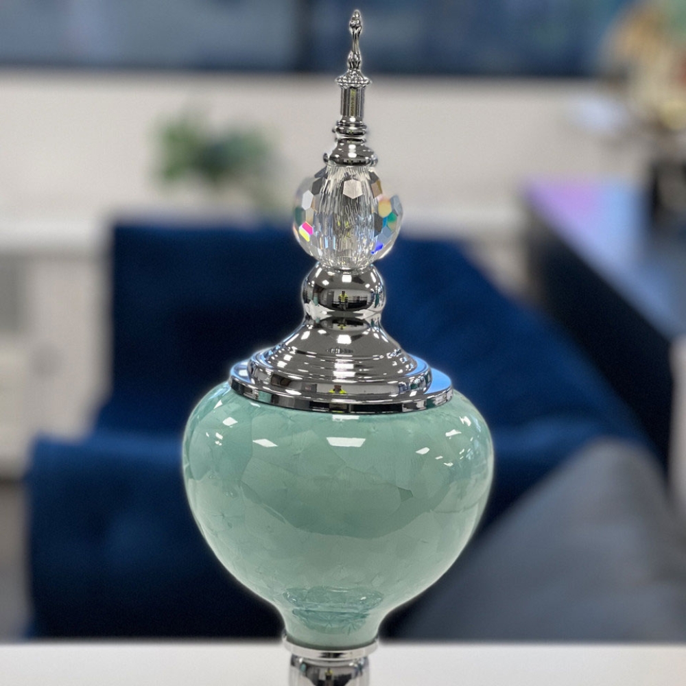 To add a luxurious blue accent to your decor, you can choose our 3 ceramic vases. The tall measures 45 x 15cm, small is 40 x 16cm and the vase with a lid is 24 x 16cm. All have a stunning polished metal base and velvet underneath to prevent scratches on your surfaces.