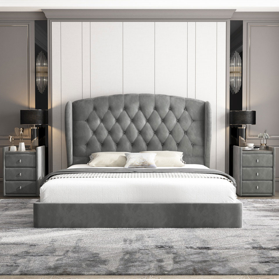 To optimise your bedroom storage, there is no better option than a gaslift bed frame. It allows you to use the entire space beneath your mattress and the gaslift makes it easy to operate. You can order in king or queen size and the headboard stands 133cm tall. The frame is upholstered in grey fabric with luxurious tufting on the headboard.