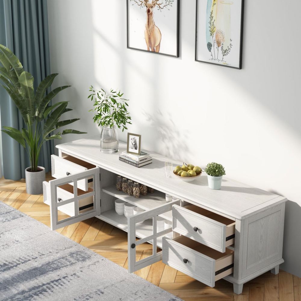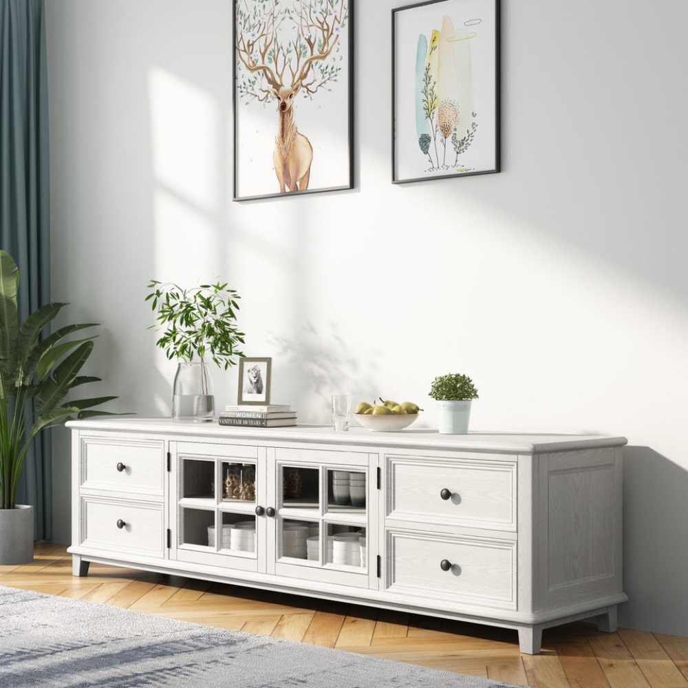 The Hampton TV unit has a distinct country home aesthetic and offers plenty of storage space. It has 2 doors fitted with tempered glass, which is strong and durable. The 4 drawers can help keep your space looking tidy. The unit is made from quality American ash wood and New Zealand pine and comes with a 2-year manufacturer warranty.
