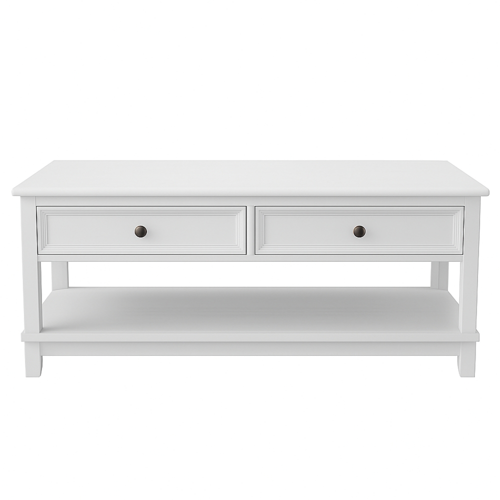 Made with beautiful American ash wood and New Zealand pine, the Hampton coffee table has a country home aesthetic that can fit traditional and contemporary homes. It has 2 drawers for storing the essentials that have decorative bevelled edges and metal handles. It is coated in a neutral matte white paint to complement your decor.