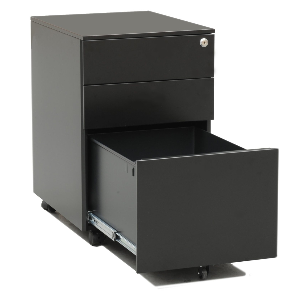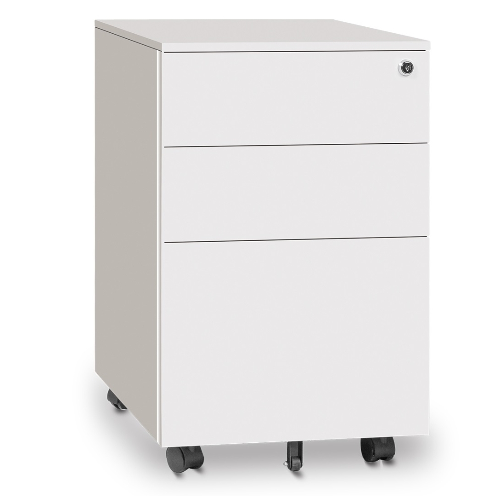 Compact mobile pedestal with 1 file drawer, 2 personal drawers, a pen tray, and a 5th wheel for stability. Finished in White or Black with a durable powder-coated finish. Dimensions:390x520x600 mm. Warranty: 5 years.