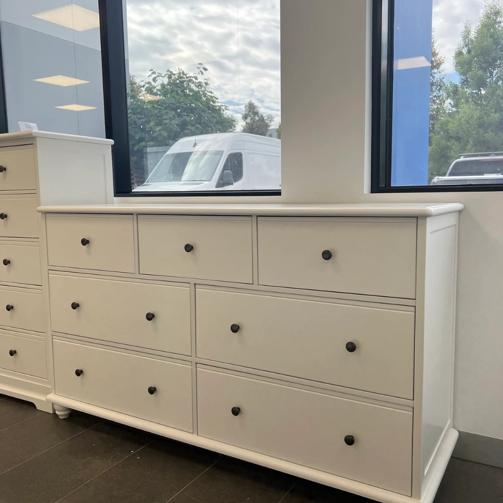 Simple but elegant, the Olivia chest offers ample storage for clothing and linens. It has 3 small drawers and 4 larger drawers on soft close rails and the unit measures 154 x 51 x 89cm. The chest is made from strong New Zealand pine and coated in a non-toxic, zero VOC Eco Paint. The metal knob handles have a brass finish and you can use the anchor device for extra safety. This item is in stock and available for immediate dispatch from our warehouse.