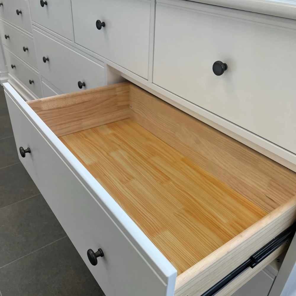 • inner dimensions for drawers. Top 3 Drawers: Width 43cm, Depth 39cm, Height 14cm. Big 4 drawers. Width 68cm, Depth 39cm, Height 17cm