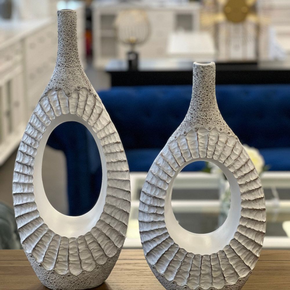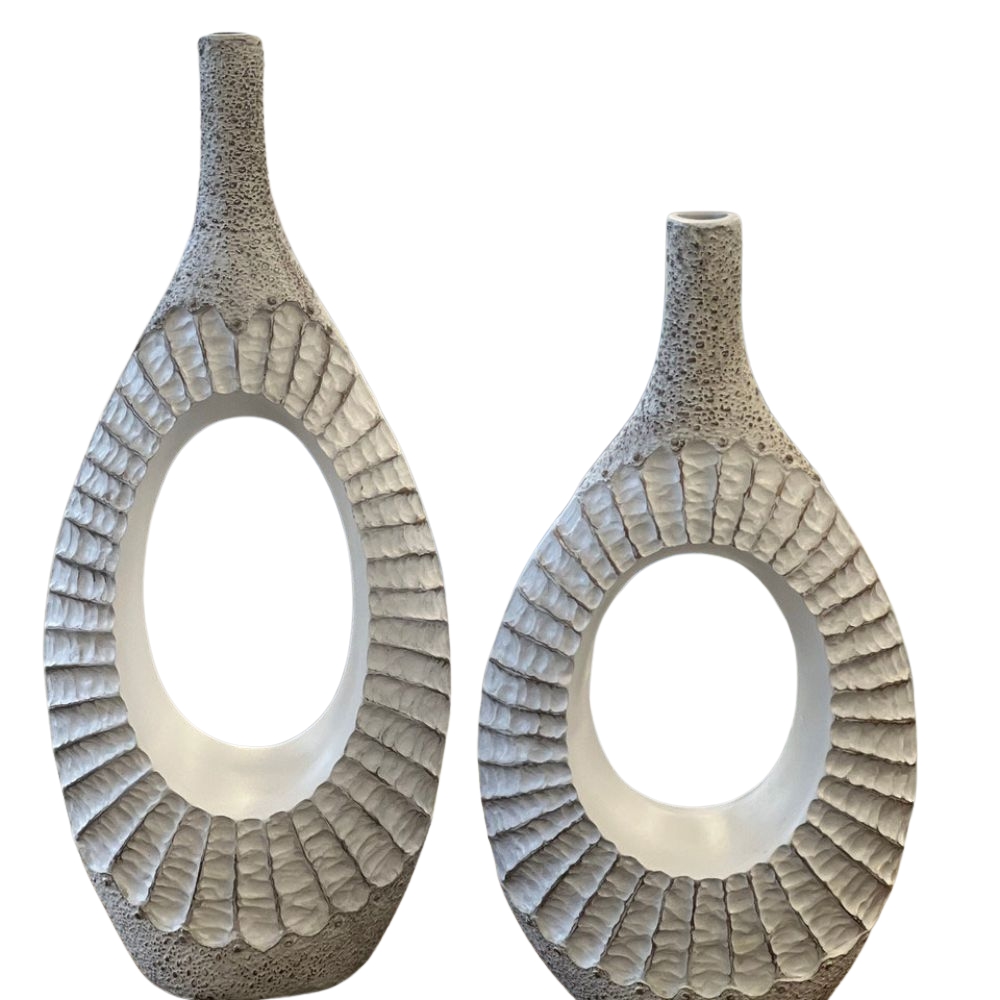 Taking inspiration from the intricacy of natural sea shells, these ceramic vases can bring a touch of the beach to your interior decor. The white and brown tones suit most decor schemes and the set offers a tall and short vase. The tall measures 57 x 25 x 12cm and the short measures 47 x 26 x 12cm.