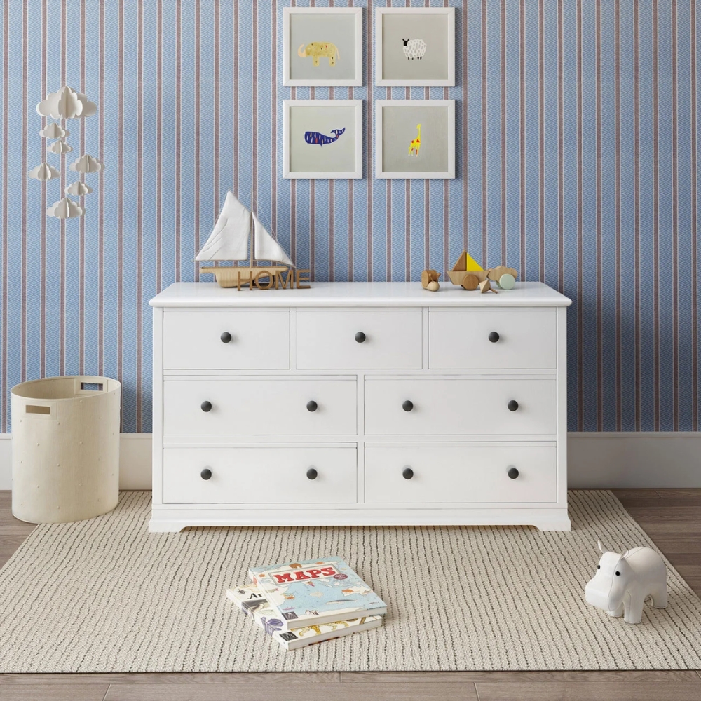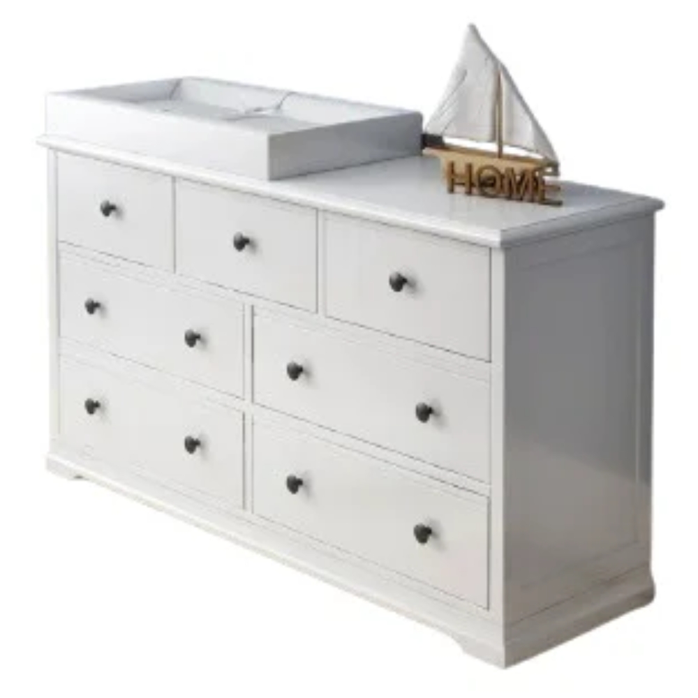 A baby change table with 7 spacious drawers on soft close rails system is perfect for nurseries. You can neatly store everything you need for changing a newborn while benefiting from the removable, waterproof changing pad on top. The unit is made from sturdy New Zealand pine and is coated in non-toxic, zero VOC Eco Paint. This is safe for contact with expectant mothers or newborn babies. It comes with a 1-year manufacturer warranty.