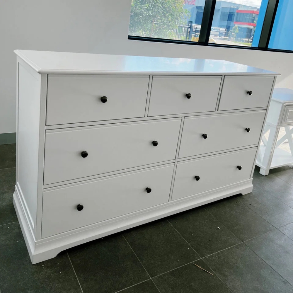 - It provides huge storage space for different household items. The top three drawers are more compact, perfect for organizing smaller essentials, while the remaining four are larger, offering ample space for clothes, linens, and more.